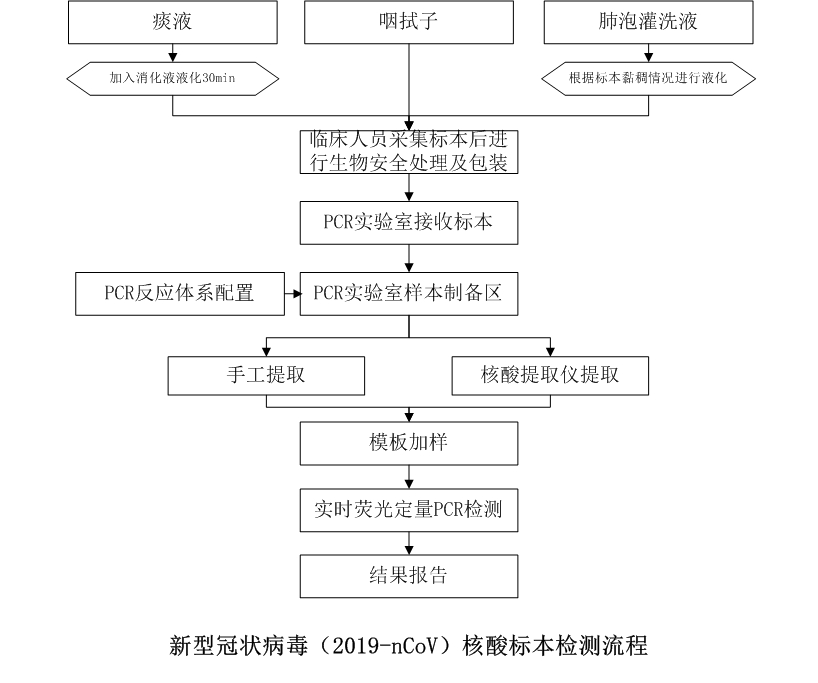 4.1 实验试剂、设备:使用到的核酸提取试剂、荧光PCR检测试剂、全自动核酸提取仪、一体化检测系统、荧光定量PCR仪均需取得医疗器械注册证。4.2 标本类型:检测的标本类型需符合试剂说明书中的标本要求。4.3 质量控制:建议每批检测设立一个弱阳性质控、三个阴性质控,三个阴性质控随机放在临床样本中间。弱阳性质控测定为阳性,三个阴性质控全部测定为阴性,视为在控。反之,则为失控,不可发出报告,应分析原因,必要时重新检测样本。4.4 结果报告:检验结果严格按照试剂说明书要求判读。在实验室要确认一个病例为阳性,满足以下条件:同一份标本中新型冠状病毒2个靶标(ORF1ab、N)特异性实时荧光RT-PCR检测结果均为阳性。如果出现单个靶标阳性的检测结果,则需要重新采样,重新检测。阴性结果也不能排除新型冠状病毒感染,需要排除可能产生假阴性的因素,包括:样本质量差,如口咽等部位的呼吸道样本;样本采集的过早或过晚;样本保存、运输和处理不正确;技术本身存在的原因,如病毒变异、PCR抑制等。对新型冠状病毒理化特性的认识多来自对 SARSr-CoV 和MERSr-CoV 的研究。病毒对紫外线和热敏感,56℃ 30 min、乙醚、75%乙醇、含氯消毒剂、过氧乙酸和氯仿等脂溶剂均可有效灭活病毒。氯己定不能有效灭活病毒。