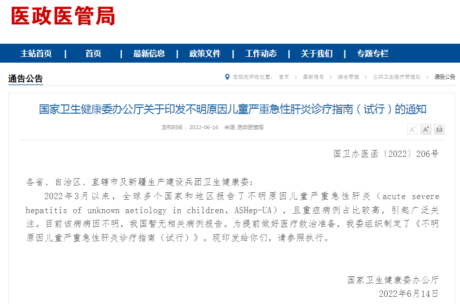 6月14日,国家卫生健康委下发《不明原因儿童严重急性肝炎诊疗指南(试行)》。具体内容如下:2022年3月31日,英国苏格兰地区首次报道不明原因儿童严重急性肝炎(acute severe hepatitis of unknown aetiology in children,ASHep-UA),此后全球多个国家或地区出现此类病…