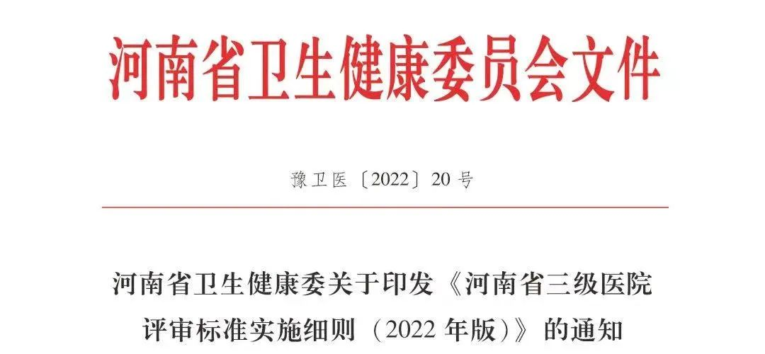 近日,河南省卫生健康委印发《河南省三级医院评审标准实施细则(2022 年版)》(以下简称《实施细则》),以进一步提高医院分级管理的科学化、规范化、标准化和精益化水平。本细则是省卫生健康委依据国家卫生健康委《三级医院评审标准(2020 年版)》和《三级医院评审标准(…