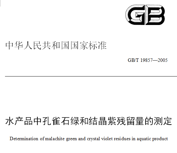 中华人民共和国国家标准GB/T 19857—2005中规定了水产品中孔雀石绿及其代谢物隐色孔雀石绿(Leucomalachite green)、结晶紫及其代谢物隐色结晶紫(Leucocrystal violet)残留量的液相色谱-串联质谱和高效液相色谱的测定…