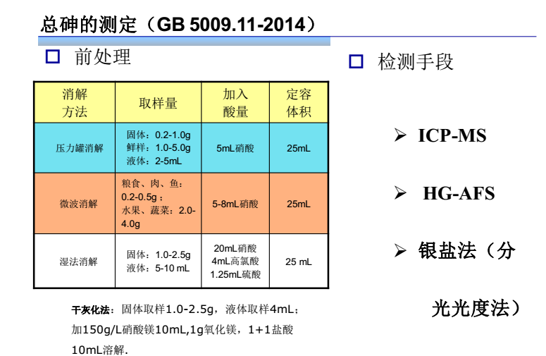 新食品安全国家标准 GB5009.11-2014 中规定了食品中总砷与无机砷的测定方法。其中,食品中总砷的测定方法包括电感耦合等离子体质谱法(LCP-MS)、氰化物发生原子荧光光谱法和 银盐法。一、食品中总砷的测定项目:总砷…