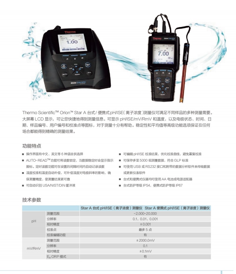 A214pH/ISE主机,8102BNUWP超纯水电极,8611BNWP钠离子电极,927007MD温度探头,096019搅拌器,电极支架,电源适配器