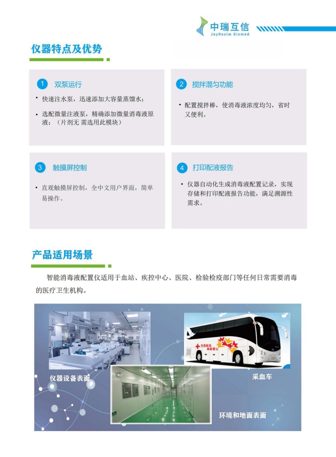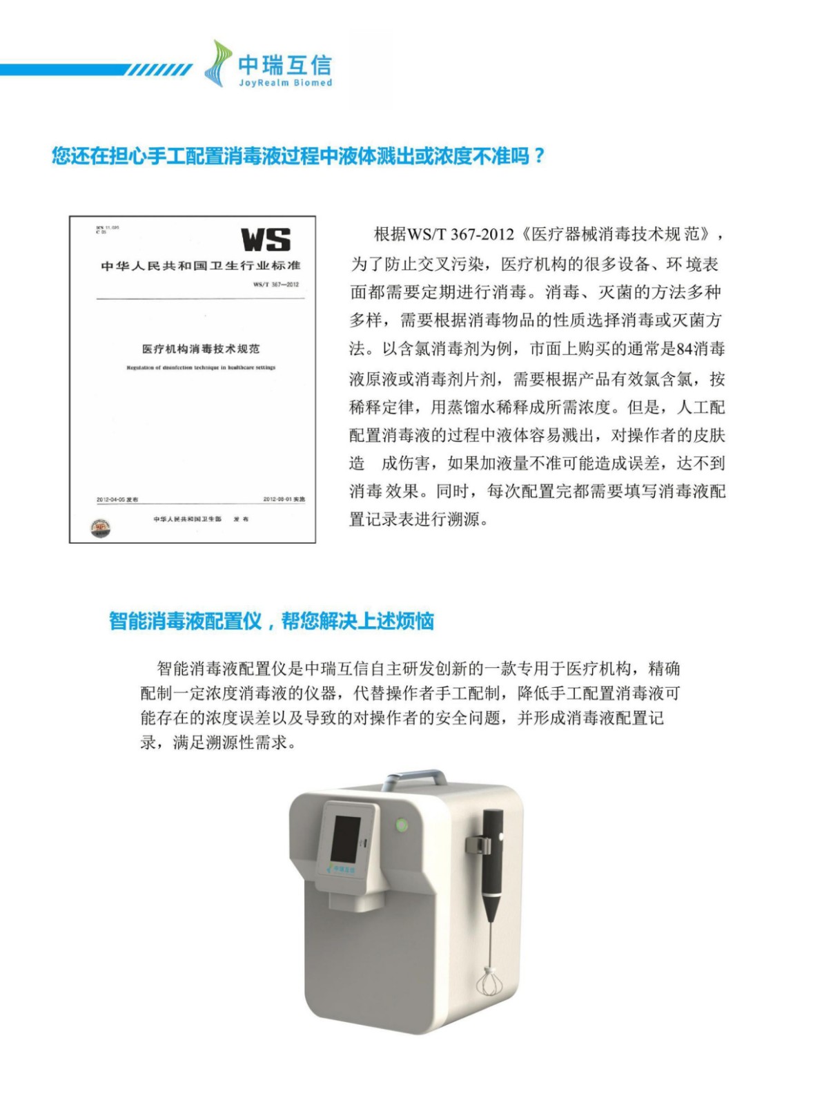 专用于医疗机构,精确配制一定浓度消毒液的仪器,代替操作者手工配制,降低手工配置消毒液可能存在的浓度误差以及导致的对操作者的安全问题,并形成消毒液配置记.录,满足溯源性需求。
