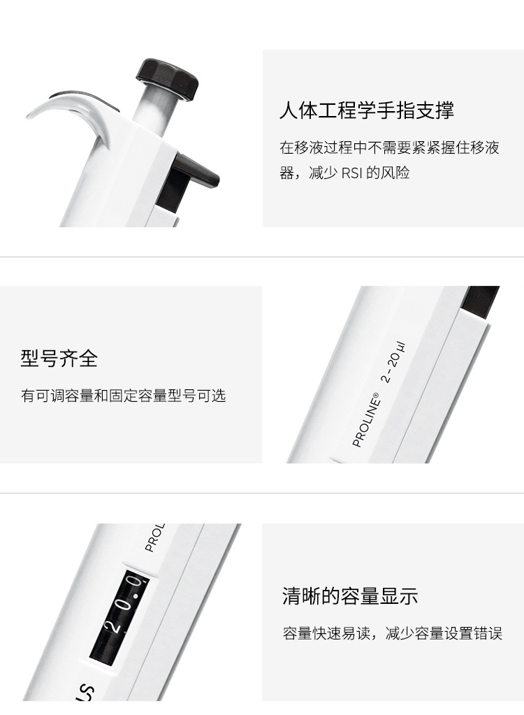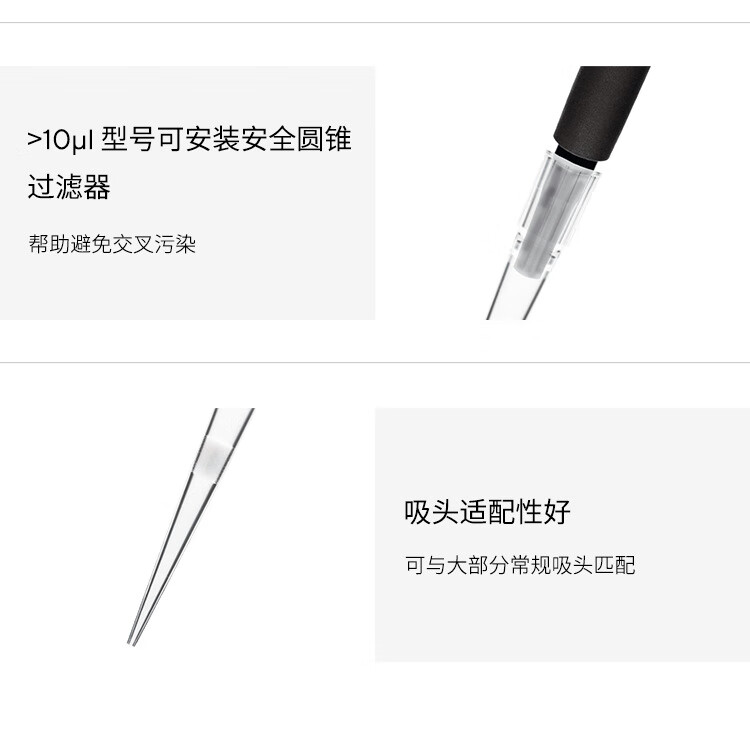 下半支可拆卸式高温、高压消毒(121°C,20分钟),配有安全圆锥虑芯,防止液体渗漏;独立式吸头推除操作,与移液过程互不干扰,不会造成排液中意外吸头推除