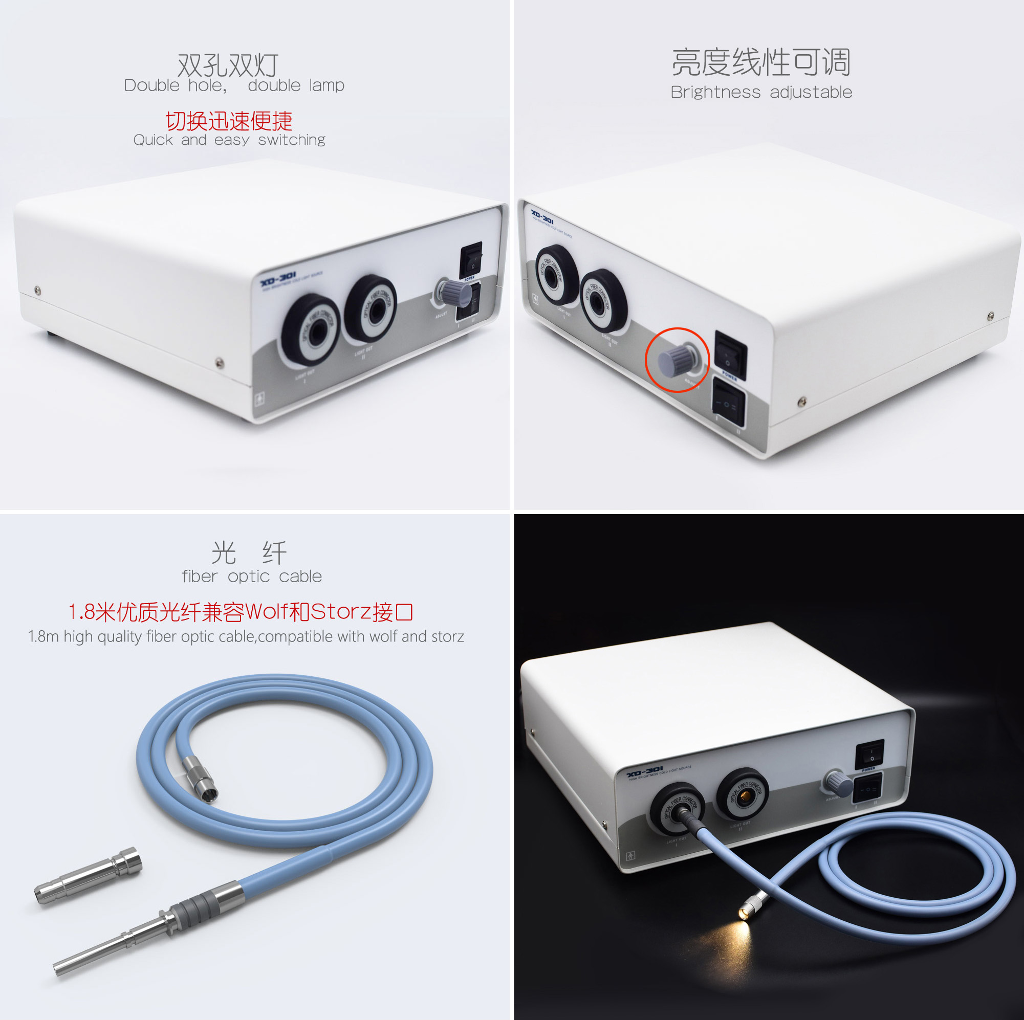 卤素光源,双孔双灯,切换迅速便捷;工作得以保障;亮度线性可调