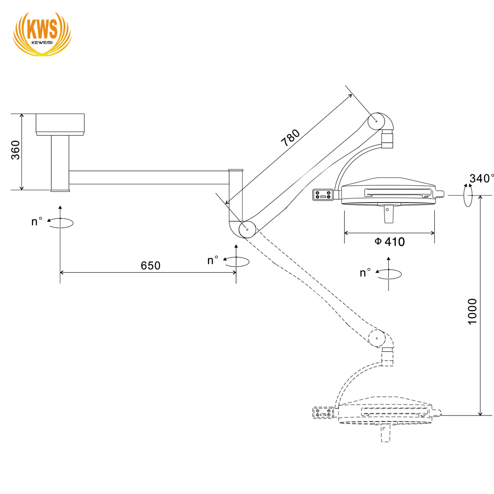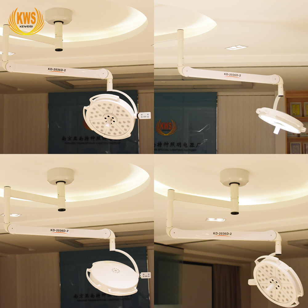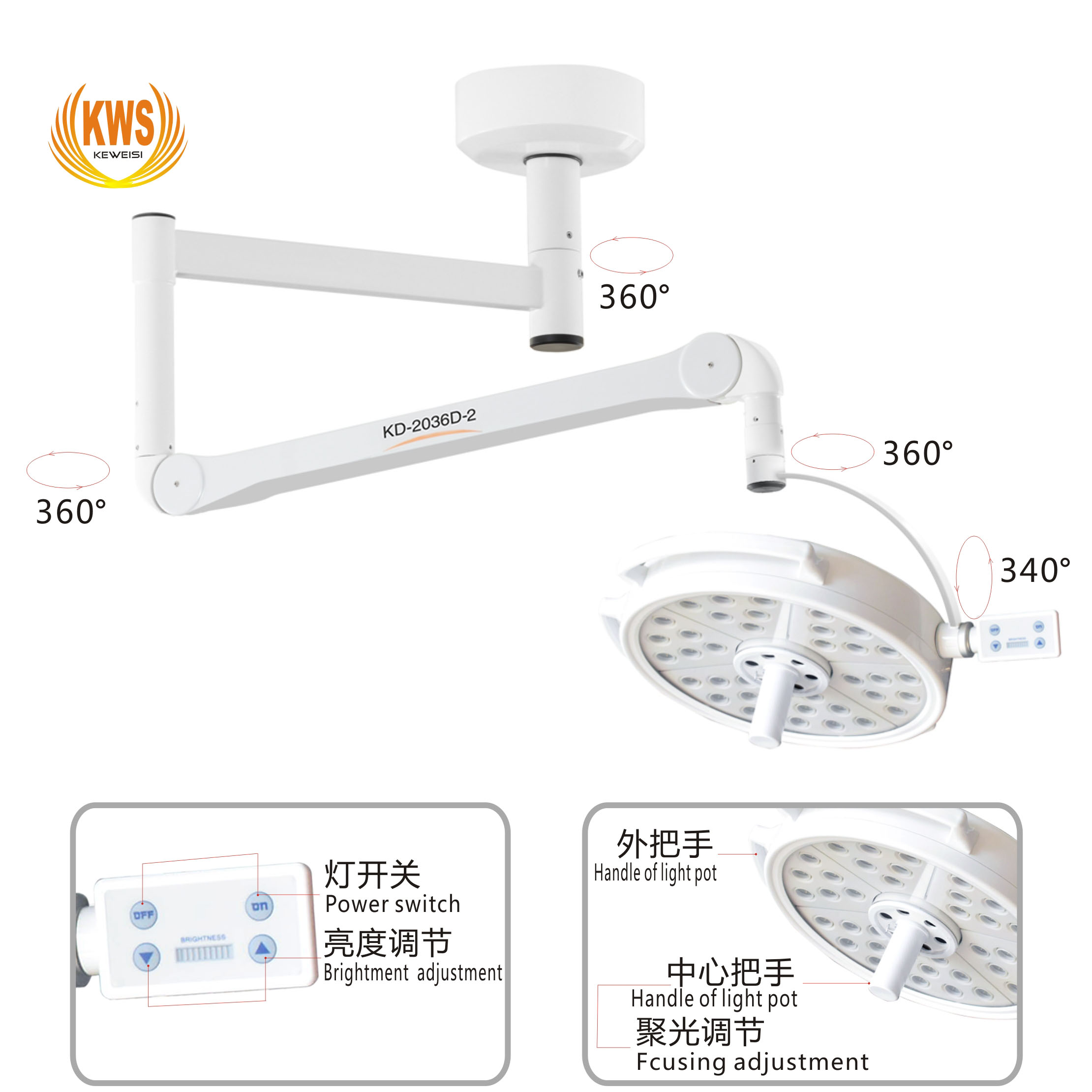 本产品灯盘500mm,比普通检查灯大,比无影灯灯盘略小。吸顶安装方式,双把手设计,中心把手光斑可调。填补了检查灯照明深度浅、照度低而无影灯价格昂贵的需求。