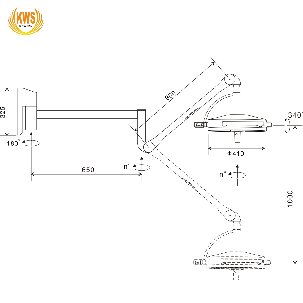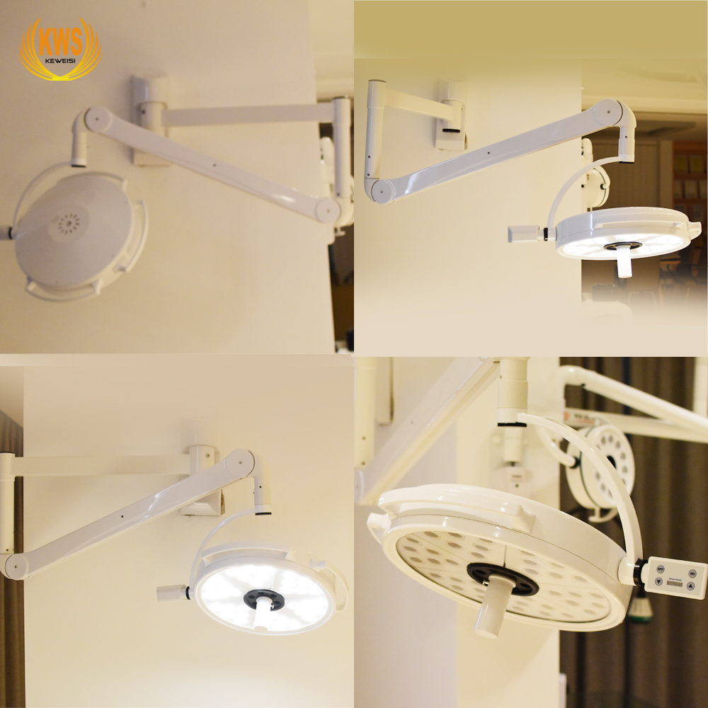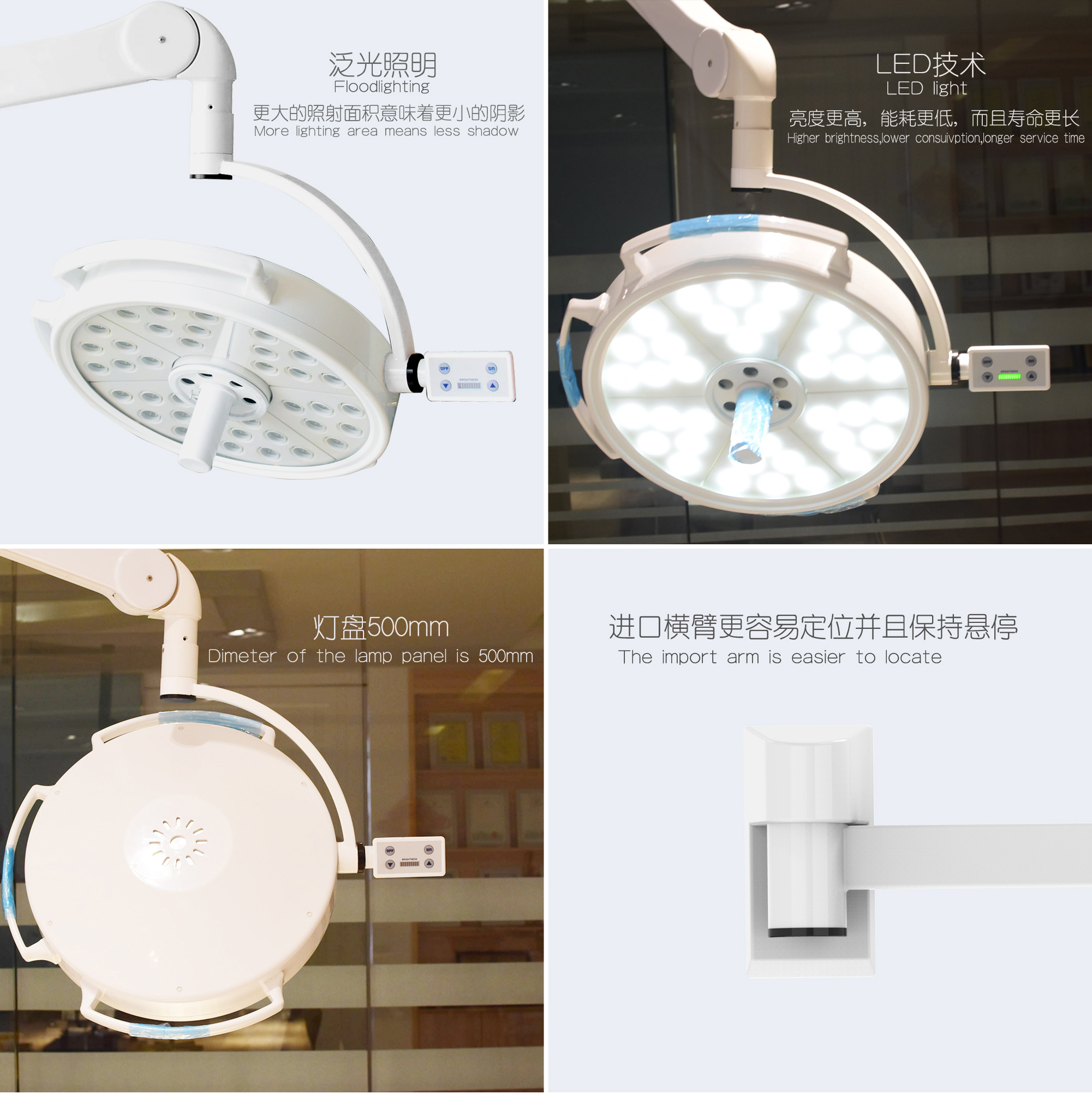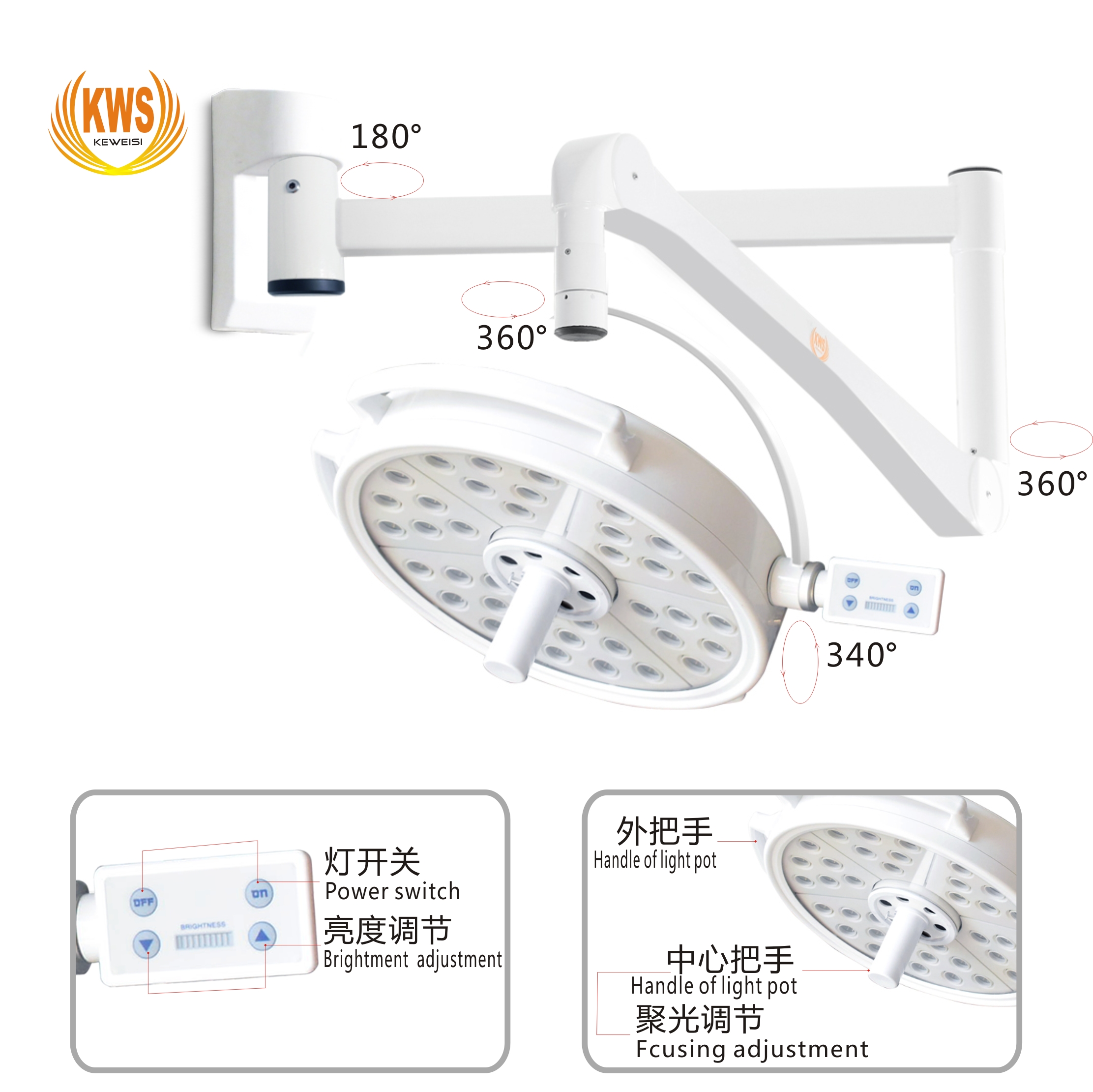 灯盘500mm,比普通检查灯大,比无影灯灯盘略小,填补了检查灯照明深度浅、照度低且没有无影效果,而无影灯价格昂贵的需求不足;墙壁安装简单易操作,灯头、灯臂自由转动,多角度照明,不用时可靠墙收拢,节省空间.