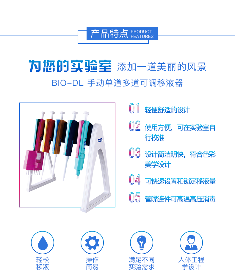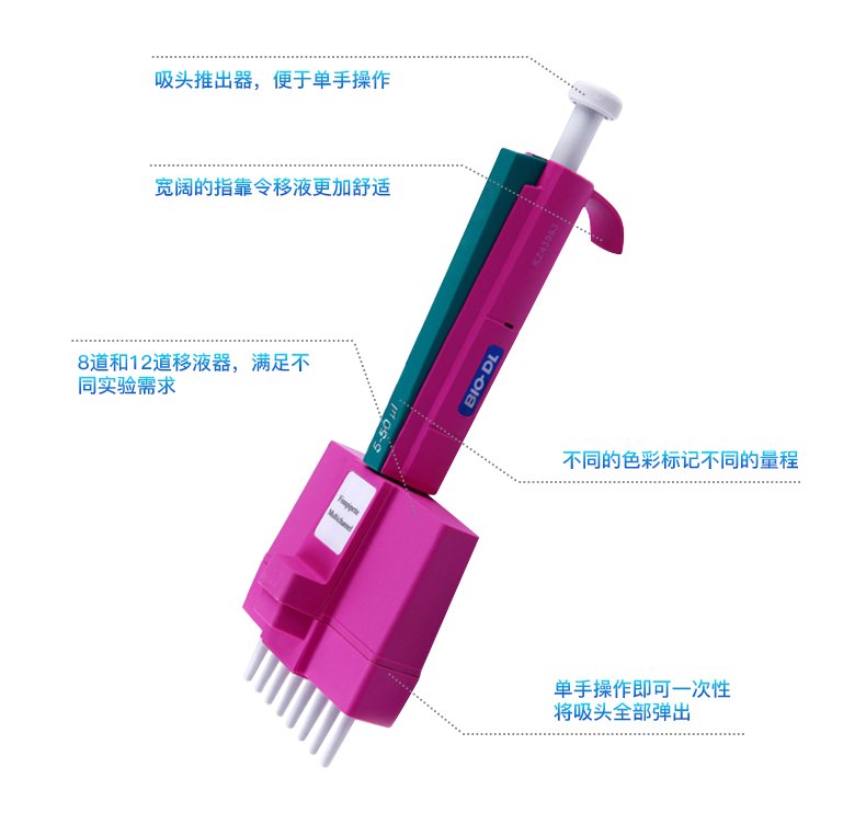 半只消毒,有针对小量程移液的双活塞设计,轻巧的操作按压力,耐化学腐蚀和收缩性低