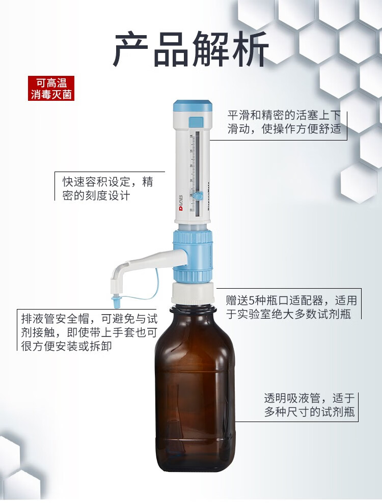 具有极强的化学耐受性;整支高温消毒灭菌;回流阀设计,减少试剂的浪费,并在非工作状态下,防滴漏;“嵌入式锁定方式”,保证了快速、可靠与高重现性的容积设定;