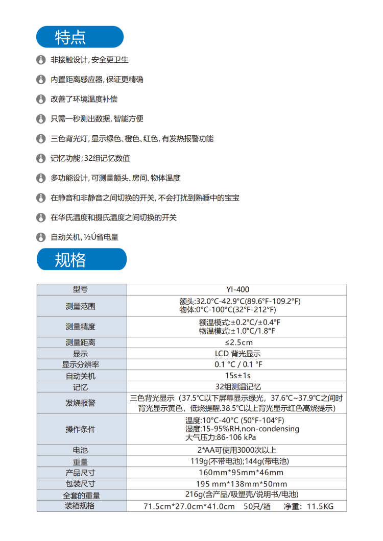 非接触式医用红外体温计YI-400